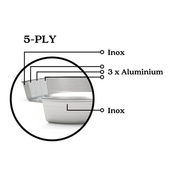 La construction en 5 plis assure une répartition uniforme de la chaleur, élimine les points chauds et vous garantit des résultats de cuisson parfaits.