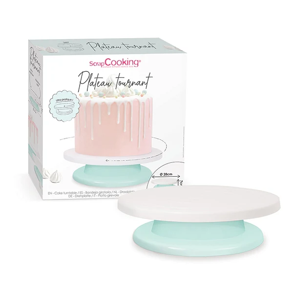 Surélevé et pivotant, le plateau tournant 28 cm est l'appareil indispensable pour réaliser des gâteaux garnis et pochés à la douille. Maniable, il est vraiment pratique : plus besoin de tourner autour de la table ! Léger, démontable, il est facile à nettoyer.